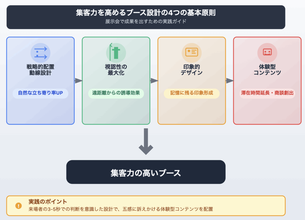 展示会ブースデザインは、企業の顔として重要な役割を果たすだけでなく、ビジネスチャンスを創出する戦略的なツールです。来場者の心理や行動パターンを理解し、それに基づいた空間設計、視覚的訴求、体験型コンテンツを組み合わせることで、集客力を最大化できます。