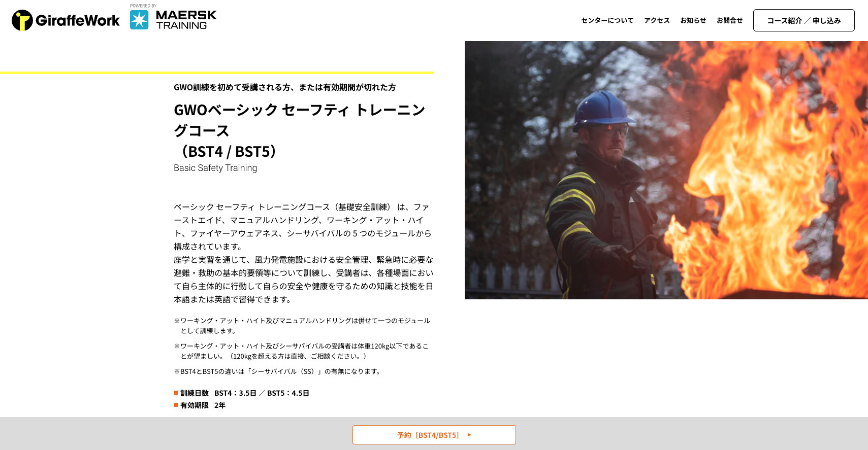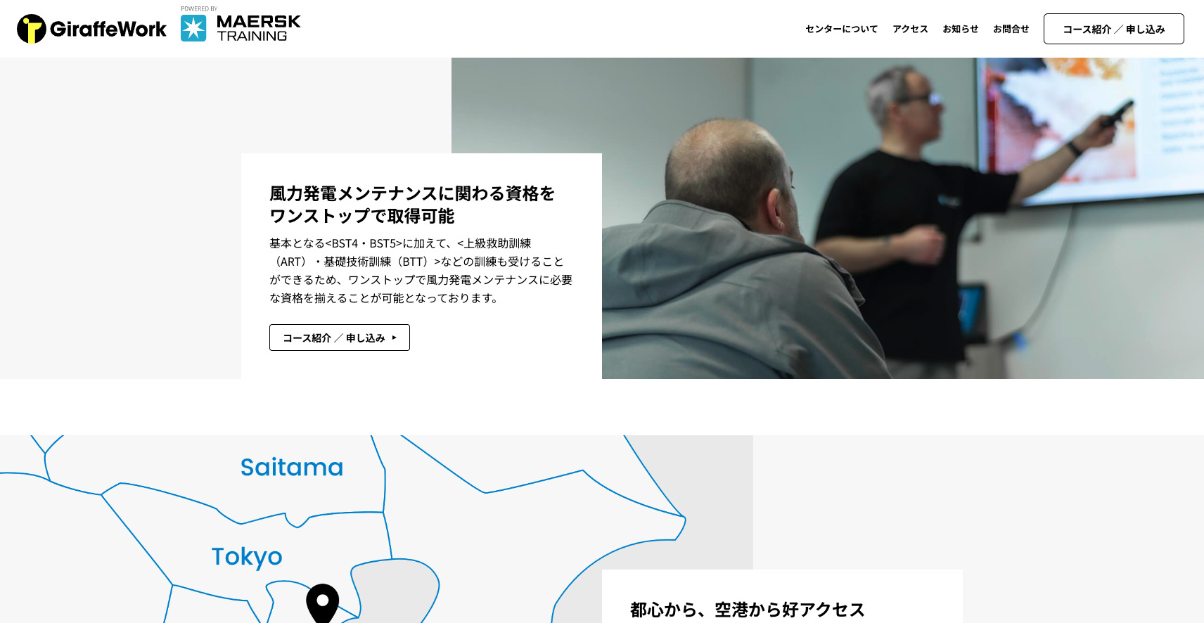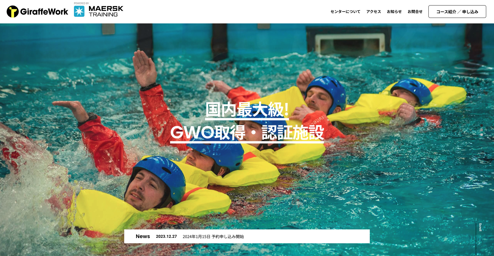 風力事業をメインドメインとしているジラフワークが、世界最大手の海運企業 A.P.モラ ー・マースクグループで船員訓練などを手掛けるマースクトレーニングとパートナーシッ プ契約を締結し、日本初の本格的なGWO認定トレーニングセンター [ジラフワークトレーニングセンター] を開設。当センターのwebサイト制作を担当。